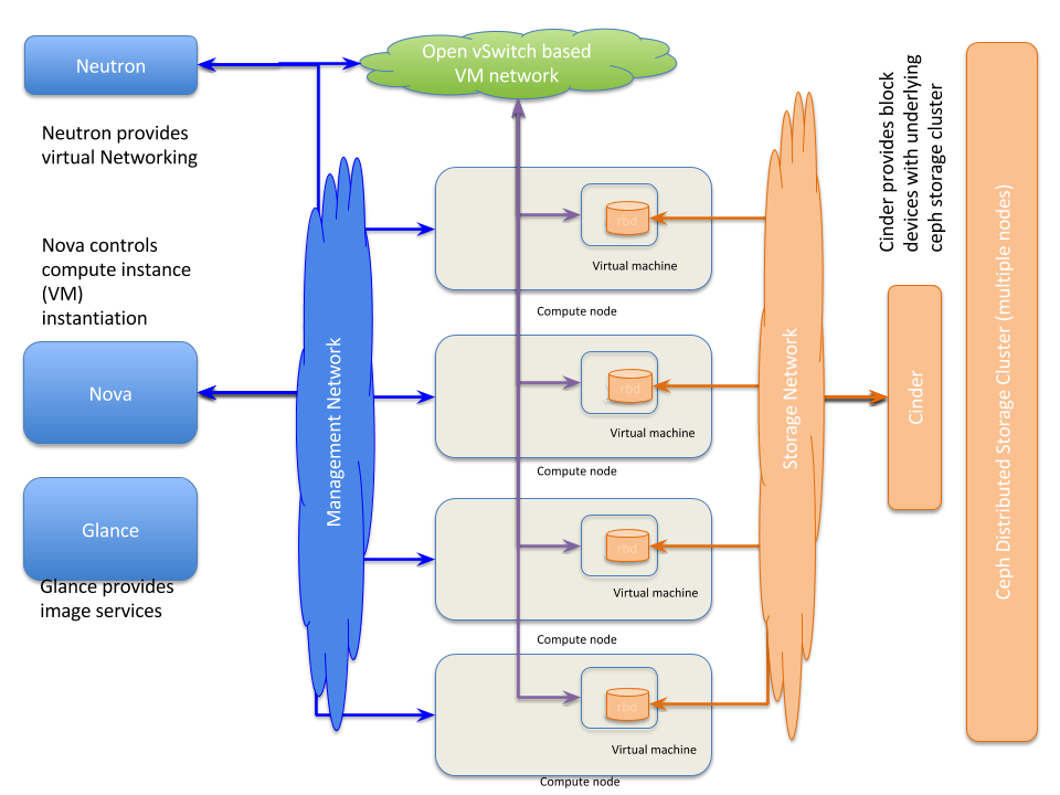 - Object Storage services provided by Swift and Ceph.