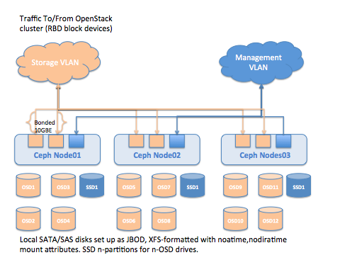 Controller and compute nodes have 3 x 10GbE NICs each - one will provide the tenant network, the other is a bonded pair of NICS for storage and management traffic which is used for OS provisioning of the physical infrastructure, as well as provide data path for other OpenStack management traffic, and storage traffic.