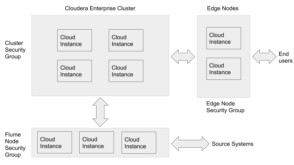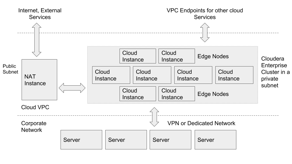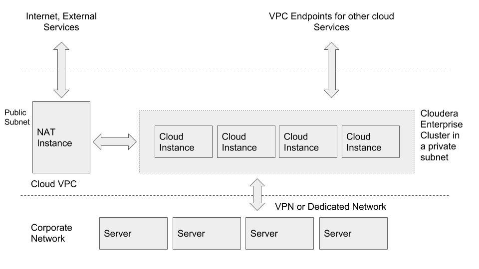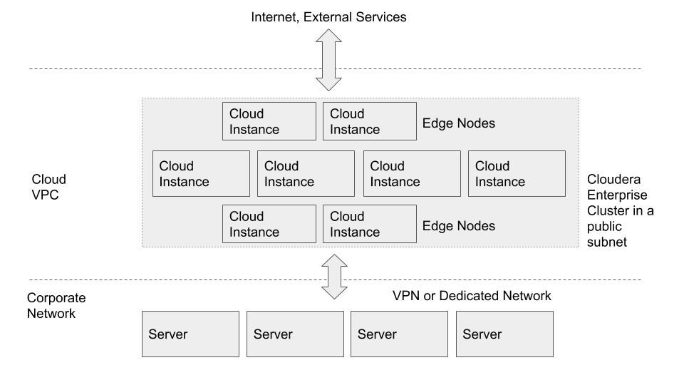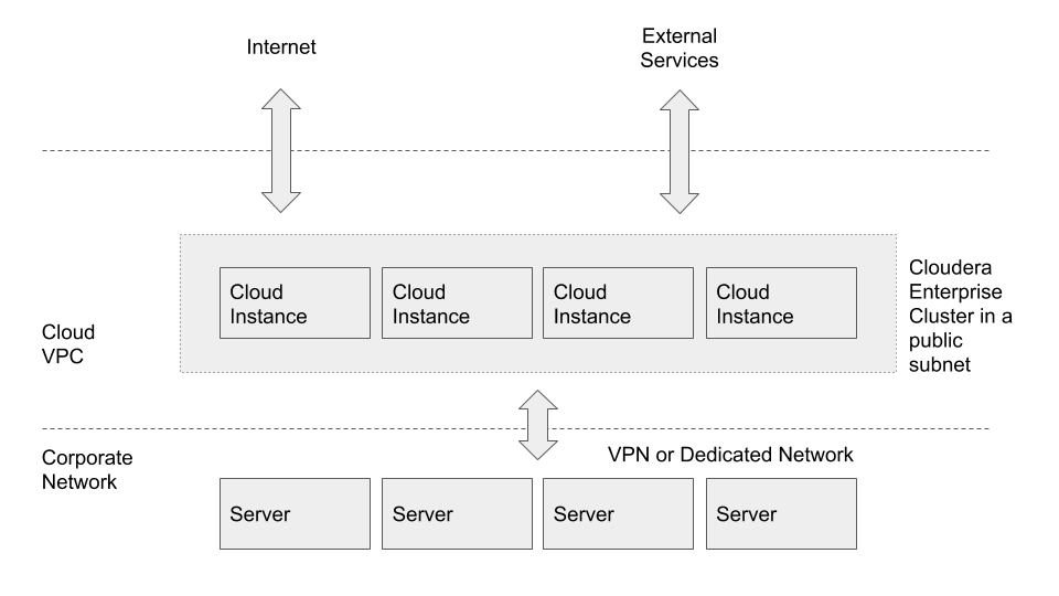 In both cases, you can set up VPN or dedicated network connection between your corporate network and the Cloud. This makes the cloud look like an extension to your network, and the Cloudera Enterprise deployment is accessible as if it were on servers in your own data center.