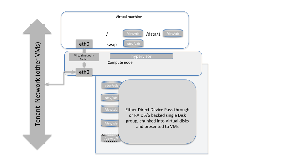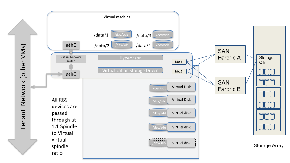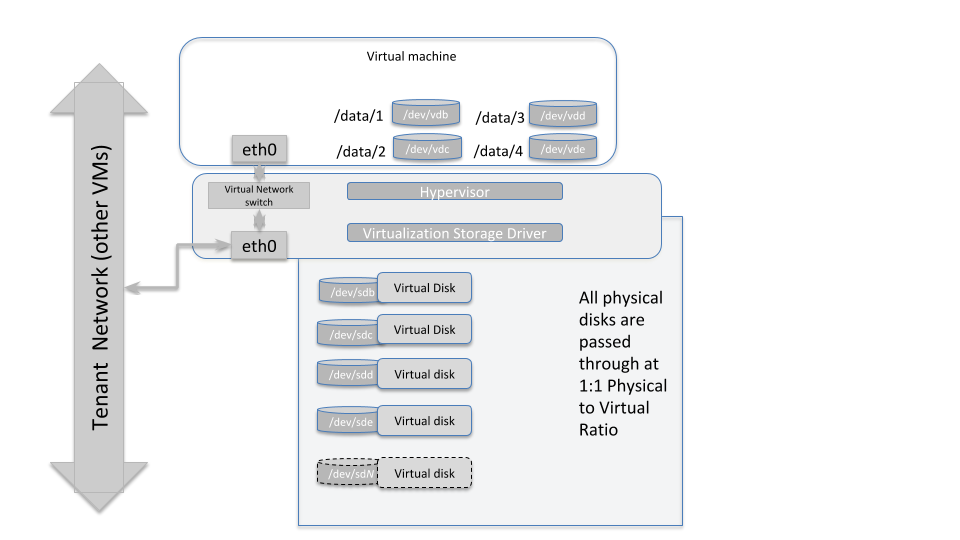 The diagram above illustrates how the storage subsystem of a worker-type node should be designed. The best practice is to obtain hardware with directly attached storage, and pass those devices through to the virtual machines running in this environment with a physical to virtual ratio of 1:1. So each physical spindle at the hypervisor level, maps to a virtual disk spindle at the VM level.