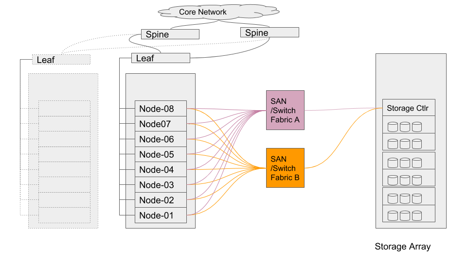 In SAN-based deployments there are typically two SAN fabrics, which are fault tolerant and most modern SAN HBAs can be effectively multipathed to provide load-balancing and higher aggregate bandwidth, depending on the SAN Storage Array controller (whether it is Active/Active or Active/Passive). The hypervisor layer needs to be aware of this topology and be configured to leverage best performance from the storage backend.