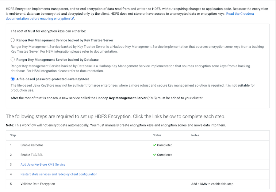 5. To set up HDFS Encryption, follow the instructions as described below for each of the Set up HDFS Data At Rest Encryption Wizard's steps.