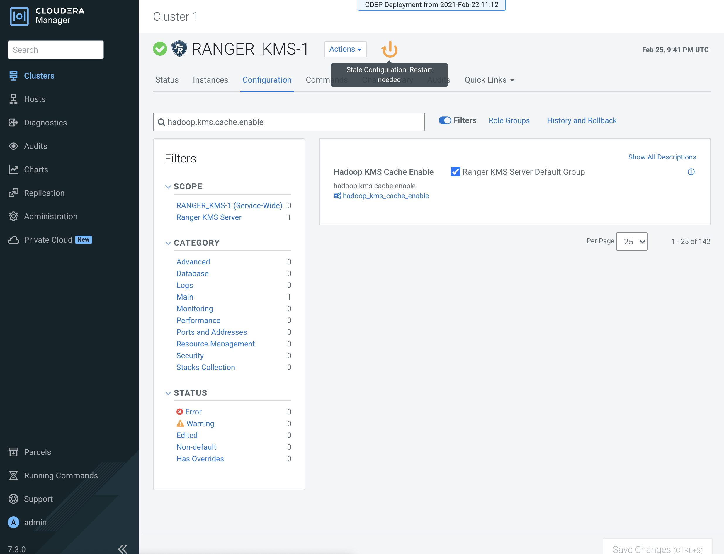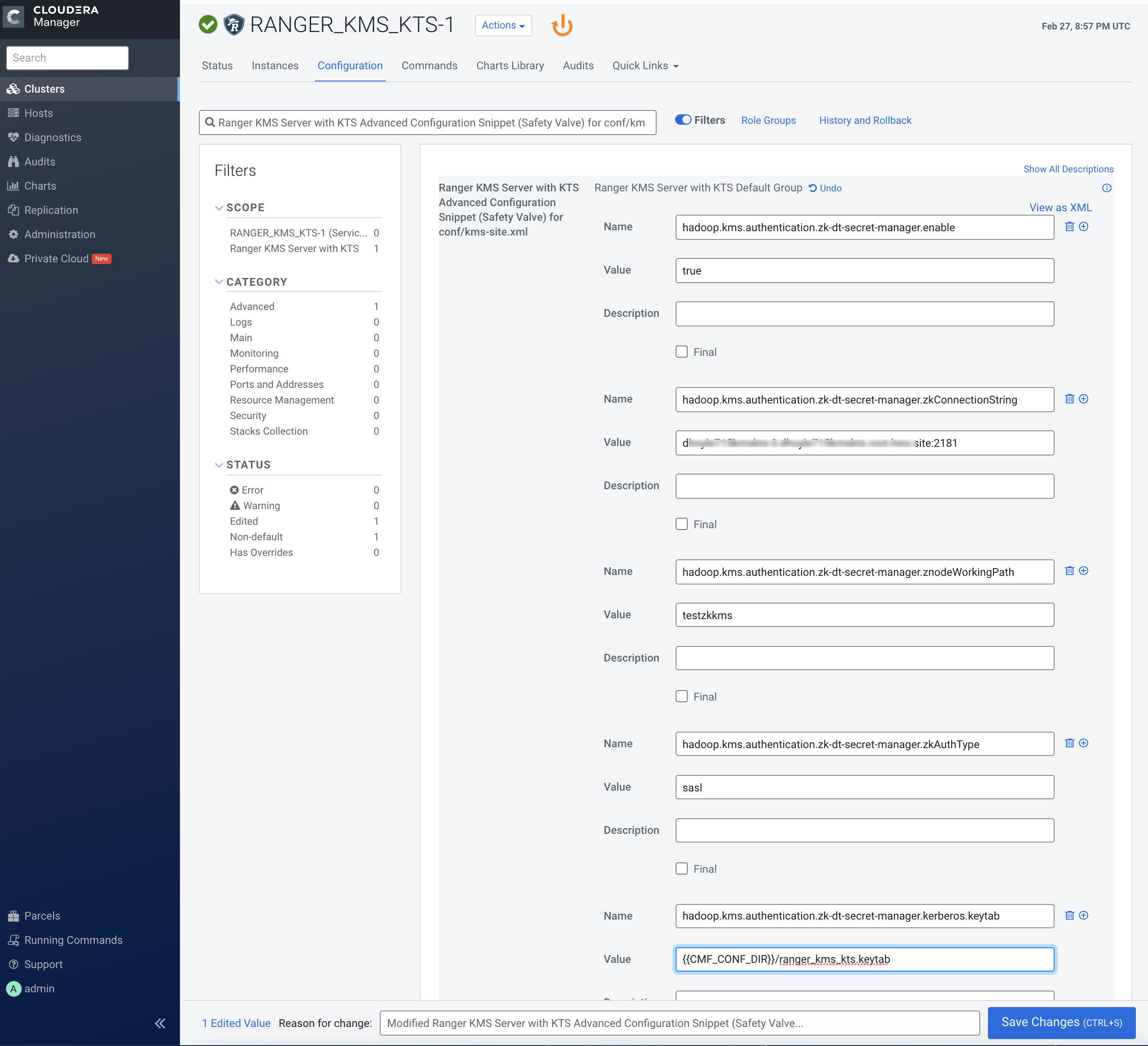 - (Ranger KMS with Key Trustee Server service only) Update the Authentication Properties and KMS Hadoop cache settings