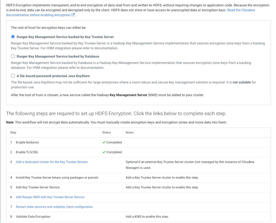 The following image shows the Set up HDFS Data At Rest Encryption page. When you select your encryption keys root of trust option, a list of tasks that you must do to enable encryption to-and-from HDFS is displayed.