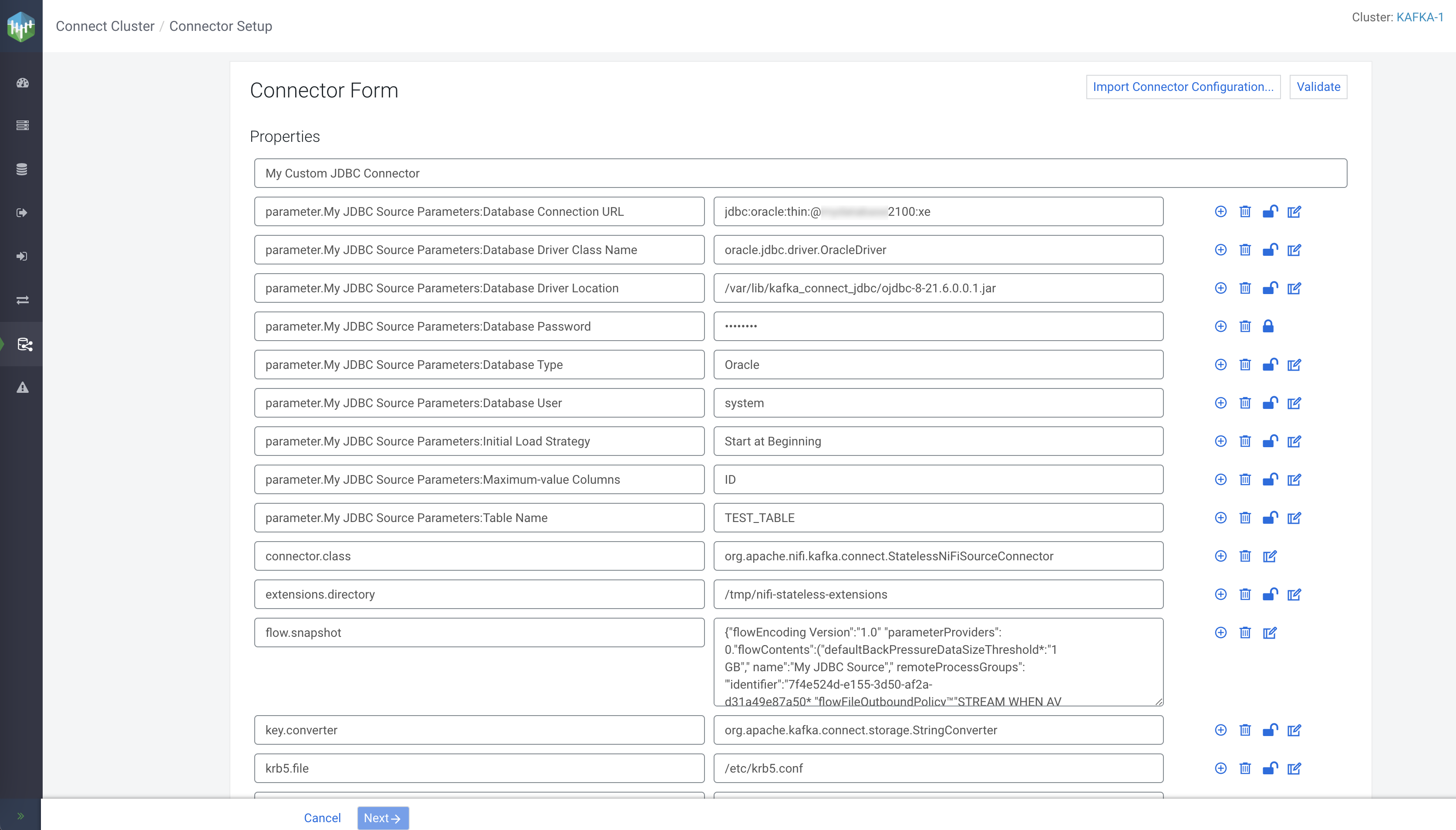 A step-by step tutorial that walks you through how you can create a JDBC Source dataflow and how to deploy the dataflow as a Kafka Connect connector using the Stateless NiFi Source connector. The connector/dataflow presented in this tutorial reads records from an Oracle database table and forwards them to Kafka in JSON format.
