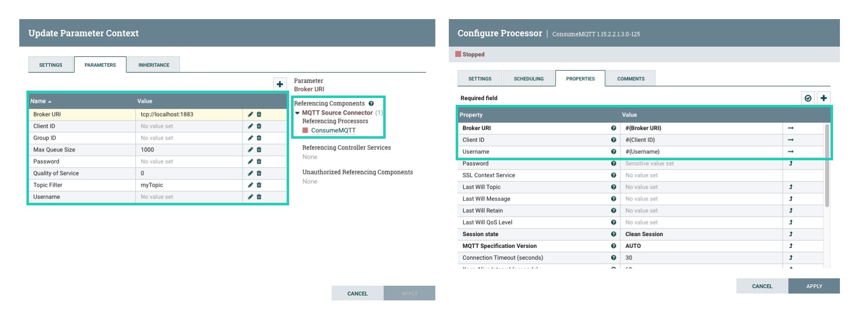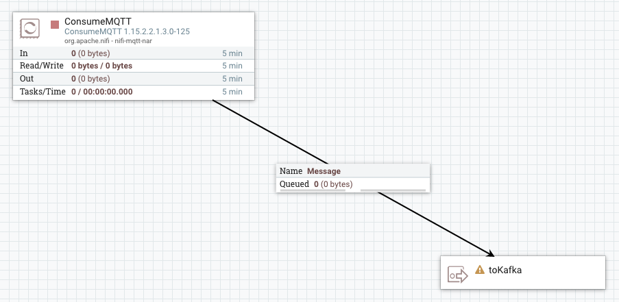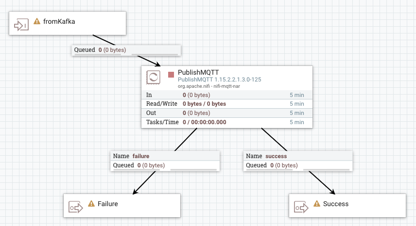 The general steps for building a dataflow are identical for both source and sink connector flows. For ease of understanding a dataflow example for a simple MQTT Source and MQTT Sink connector is provided without going into details (what processors to use, what parameters and properties to set, what relationships to define and so on).