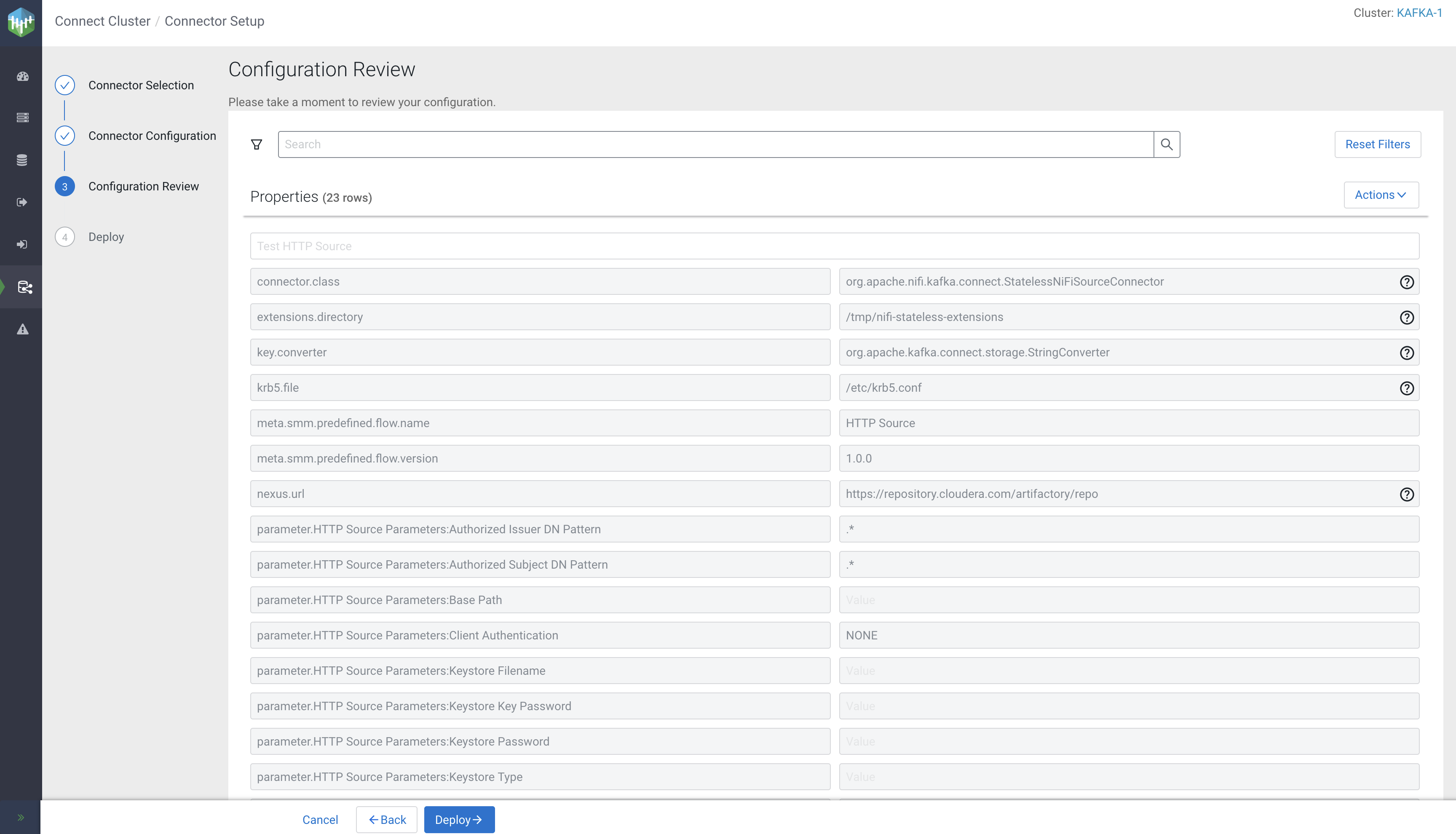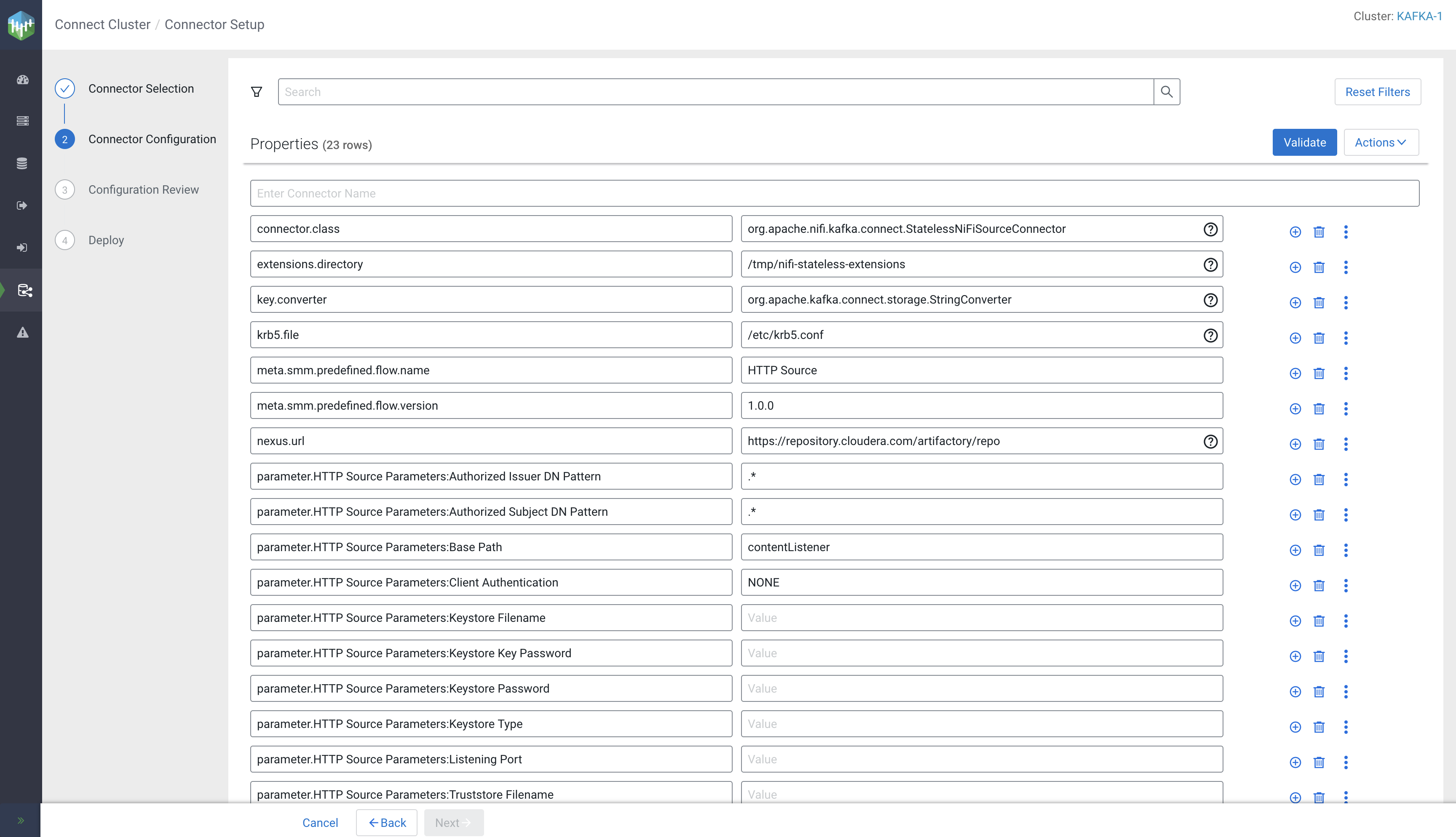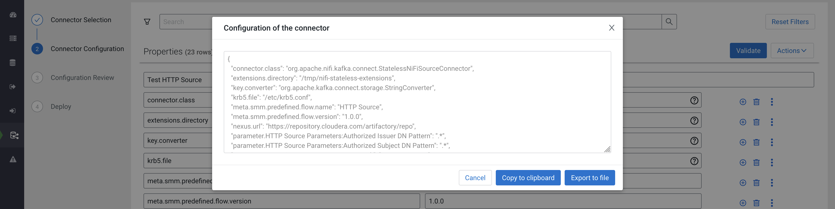 Kafka Connect connectors are deployed in SMM using the Connector Setup wizard. Learn how to deploy a new connector using the wizard.