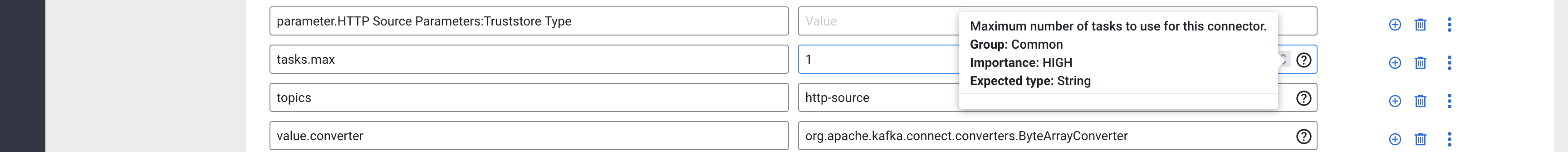 The SMM UI includes two pages where you configure Kafka Connect connector properties. The Connector Configuration step of the Connector Setup wizard and the tab. Both pages include various features and options that are designed to help you with connector configuration. The following sections go over each of the configuration options available on the UI.