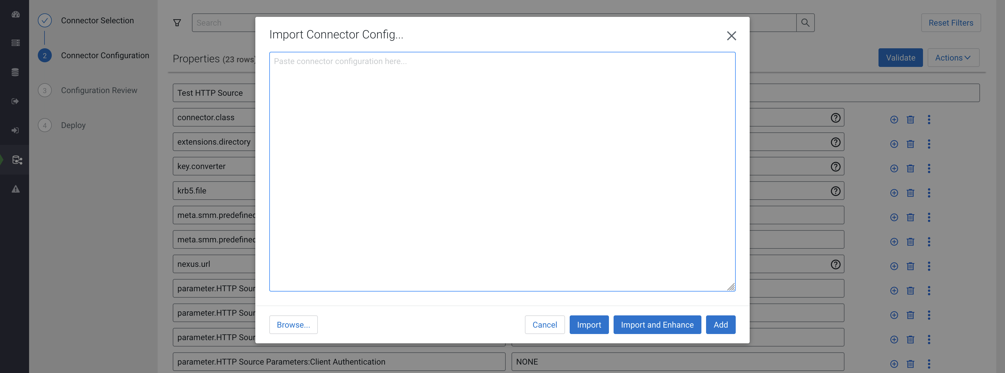 To import a configuration, click . Clicking Import opens the Connector Config… modal.