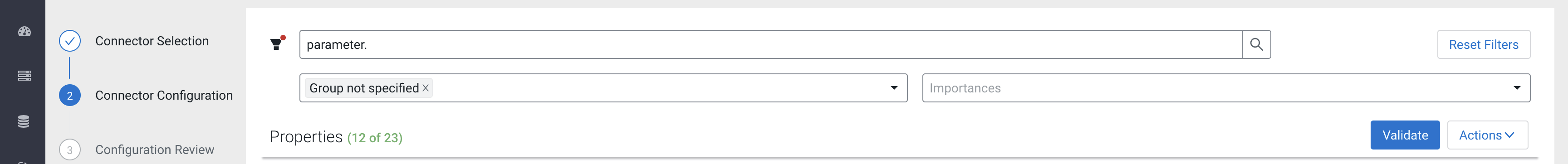 If the connector configuration is filtered when you run the validation and SMM finds errors with properties that are filtered, an error message is displayed on the top of the page notifying you that not all validation errors are visible. In a case like this, click Reset Filters to view all validation errors.