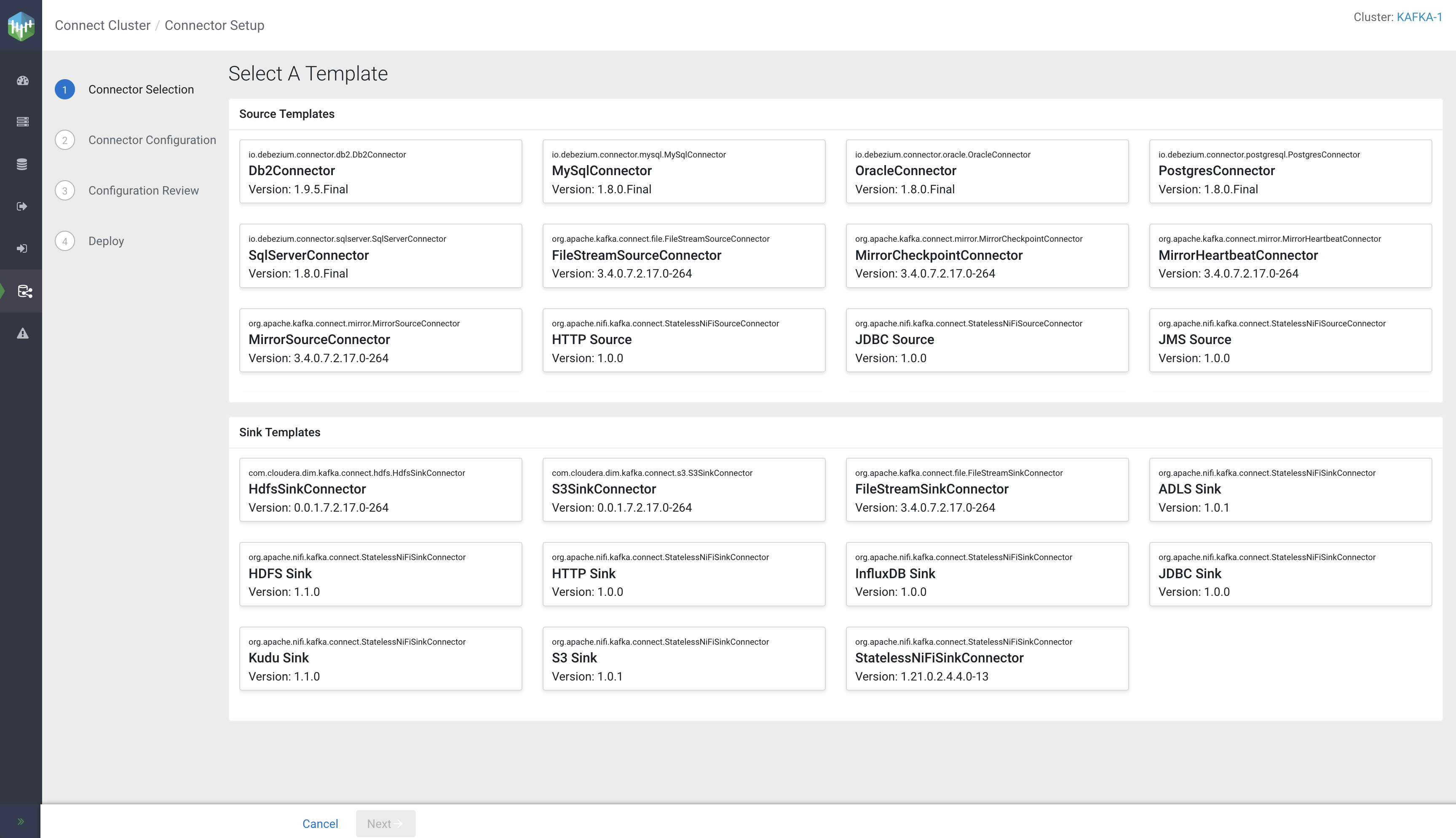 - By default, you can use the Connector Setup wizard to deploy any connector that is shipped with Cloudera Runtime. The only exceptions are the FileStream example connectors (FileStreamSourceConnector and FileStreamSinkConnector). Although these connectors are part of the Kafka distribution and are shipped with Cloudera Runtime, they are not available by default in the Connector Setup wizard. This is because neither connector is considered production ready. If you want to deploy an instance of these connectors, you must install them first. For more information, see Installing Kafka Connect connectors.