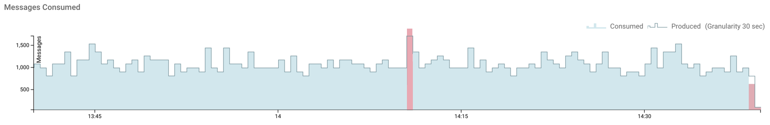 In the preceeding image, the linear formation represents the number of messages produced in last one hour, and the filled area represents the number of messages consumed in last one hour with a granularity of 30 seconds. The blue area signifies that all the produced messages are consumed. The red area represents a discrepancy in the produced and consumed message count and can either mean that messages are overconsumed or underconsumed.