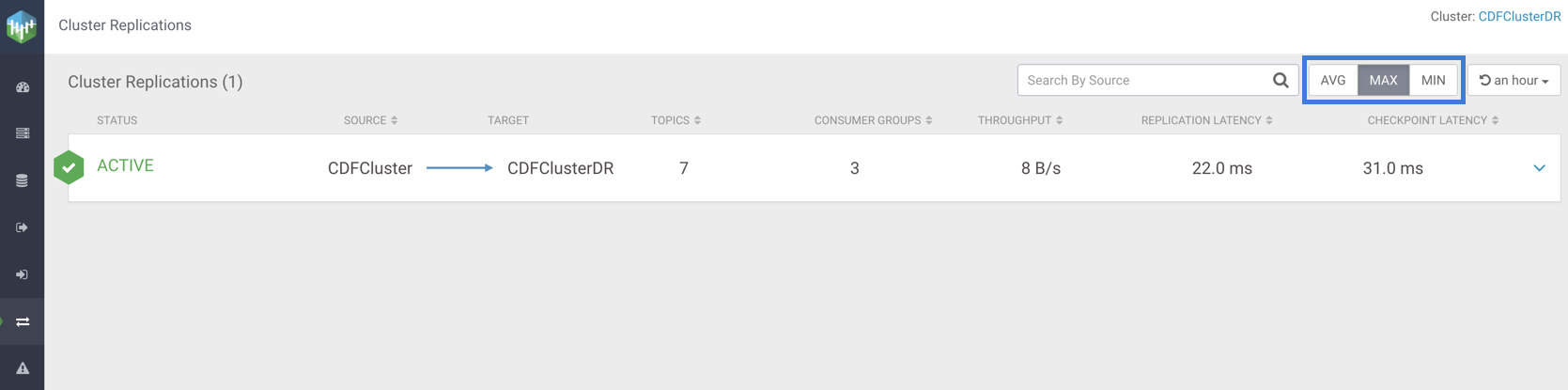 Click the AVG, MAX, or MIN buttons, as shown in the following image, to fetch average, maximum, or minimum values of throughput, replication latency, and checkpoint latency for cluster replications.