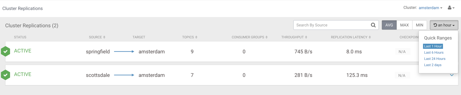 Learn how to filter your cluster replications by specific time periods after you select the Kafka cluster which acts as the target cluster.