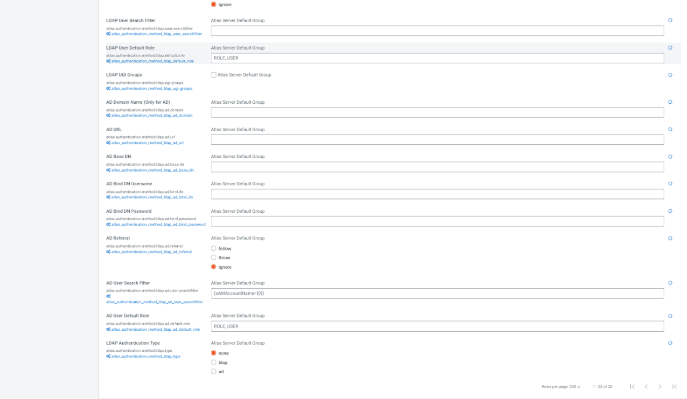 4. Selecting “ldap”, prompts you to use appropriate LDAP values to complete the Atlas authentication type.