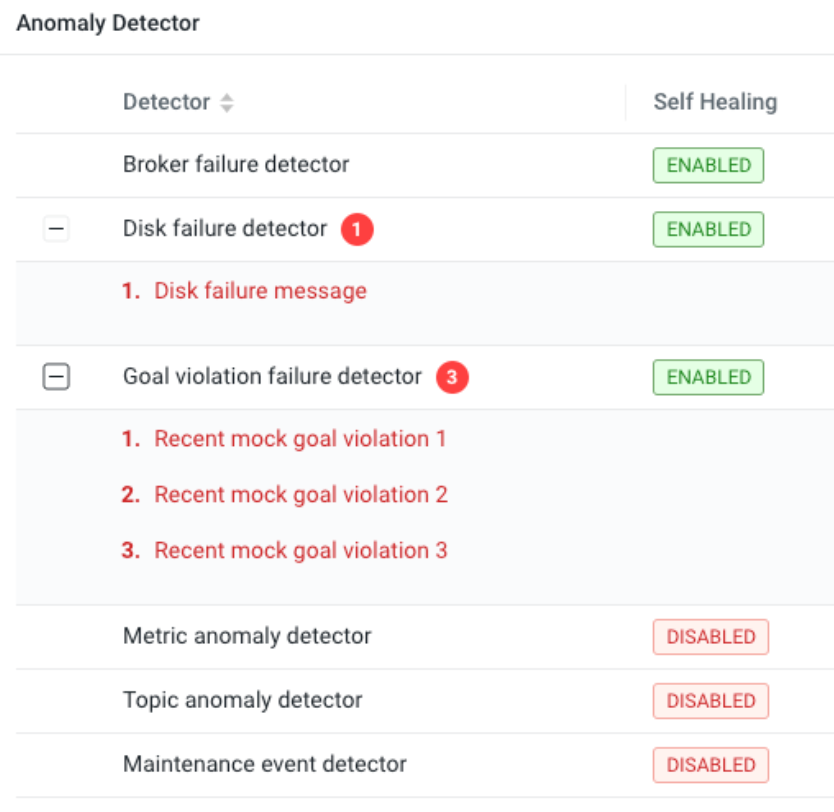 The Anomaly Detector tile shows the list of anomaly detectors and whether self-healing is enabled for the given detector. If there are any anomalies found by the detectors, the anomalies are listed under the corresponding detector.