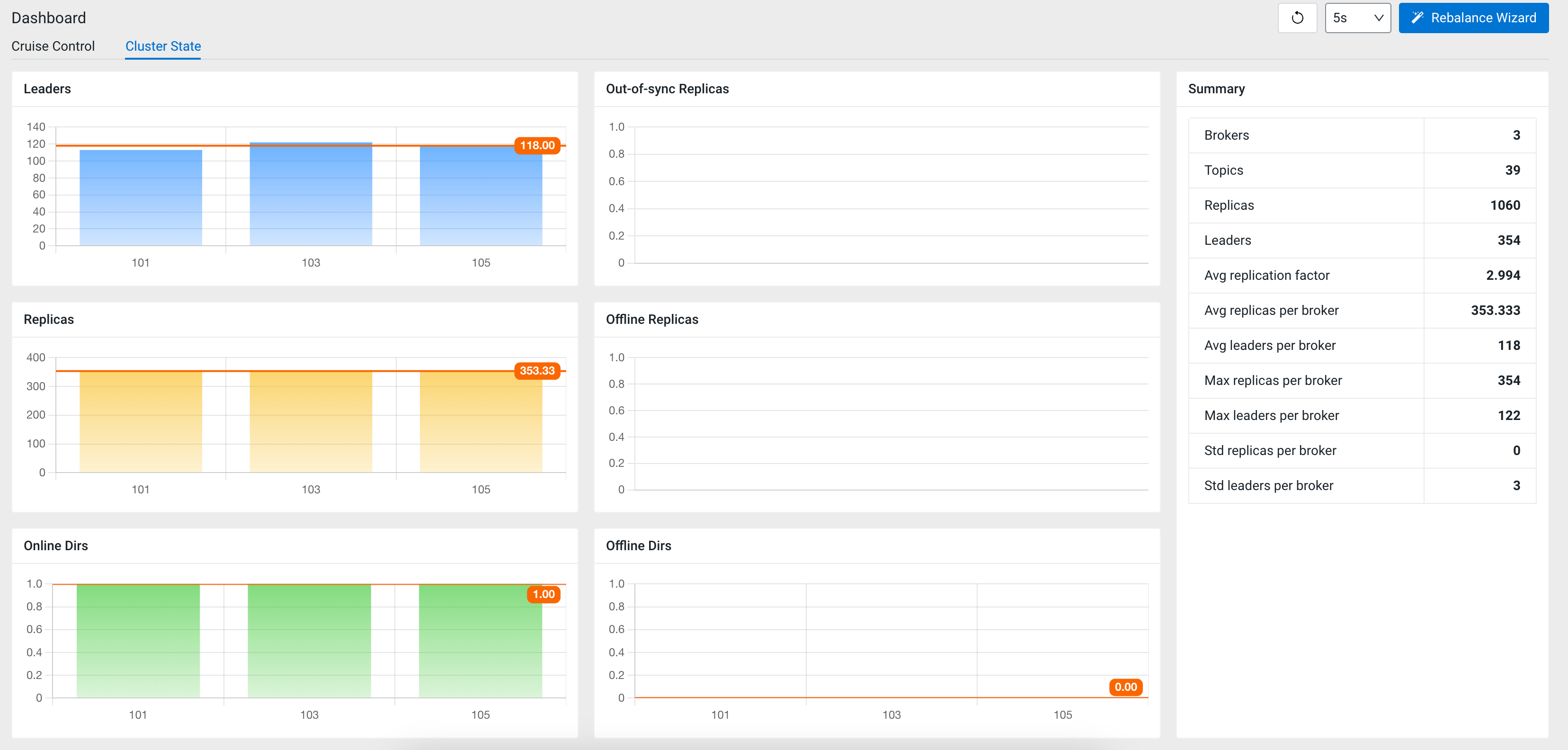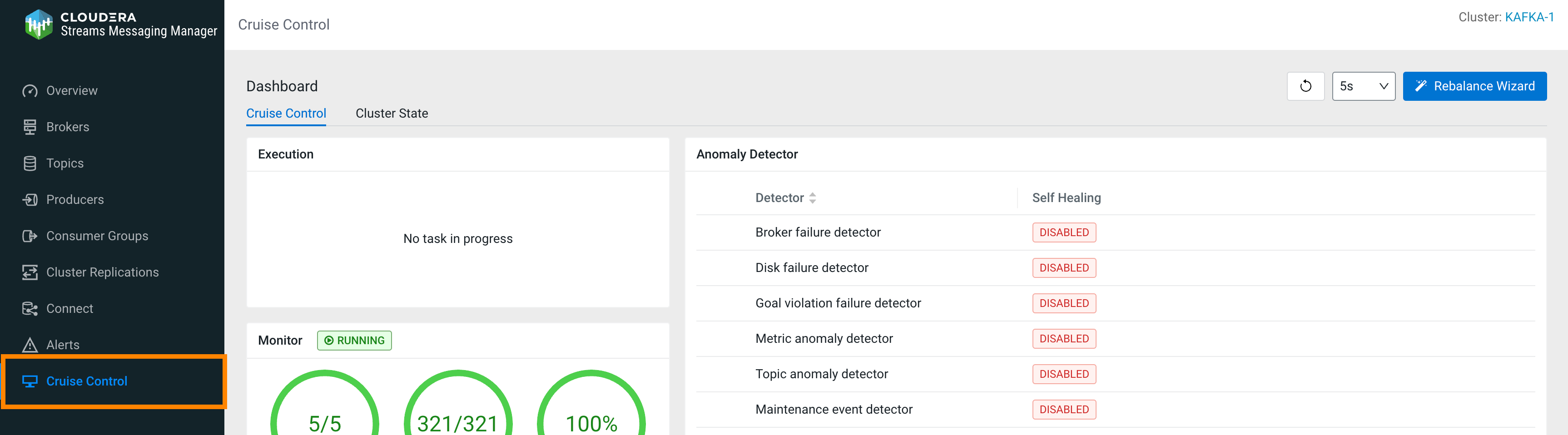 The Cruise Control UI in Streams Messaging Manager allows you to monitor the state and operations of the Cruise Control service, including the latest state of the Kafka cluster known to Cruise Control. The Rebalance Wizard allows admins to start rebalance operations, specifying goals, anomaly detectors and estimations that should be used for generating the rebalance proposals. You can access the Cruise Control UI from the left navigation pane of Streams Messaging Manager. Clicking on loads the Cruise Control Dashboard.