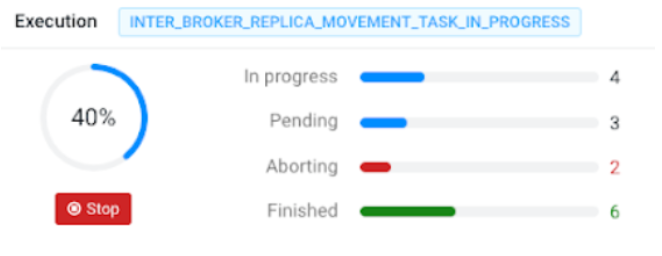 The Execution tile of the Dashboard allows you to track and monitor the tasks being executed by Cruise Control (including rebalancing tasks that are triggered by the enabled goals or other operations started through the REST API). If the goals are fulfilled and there is no ongoing execution, the No task in progress message is shown. Only users with Admin level can stop the execution process.