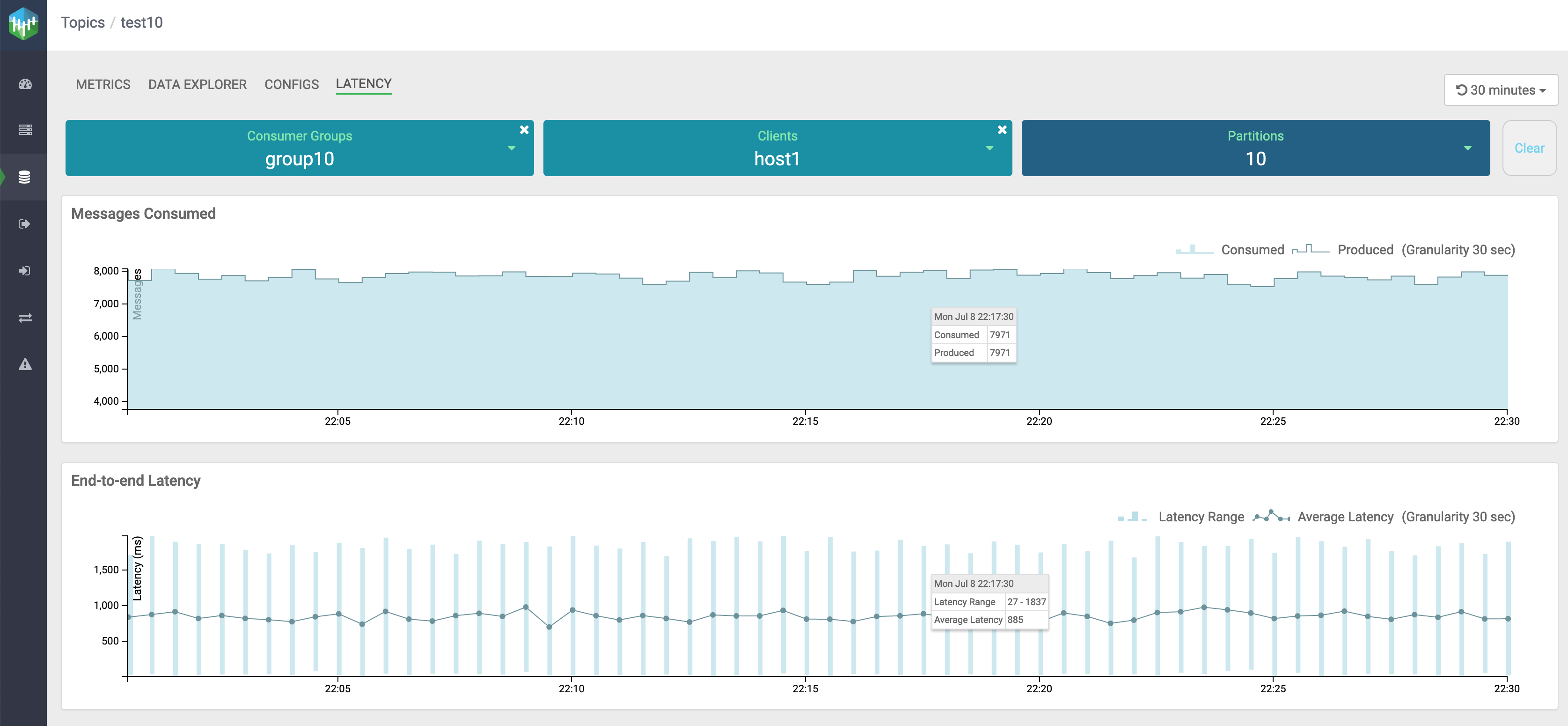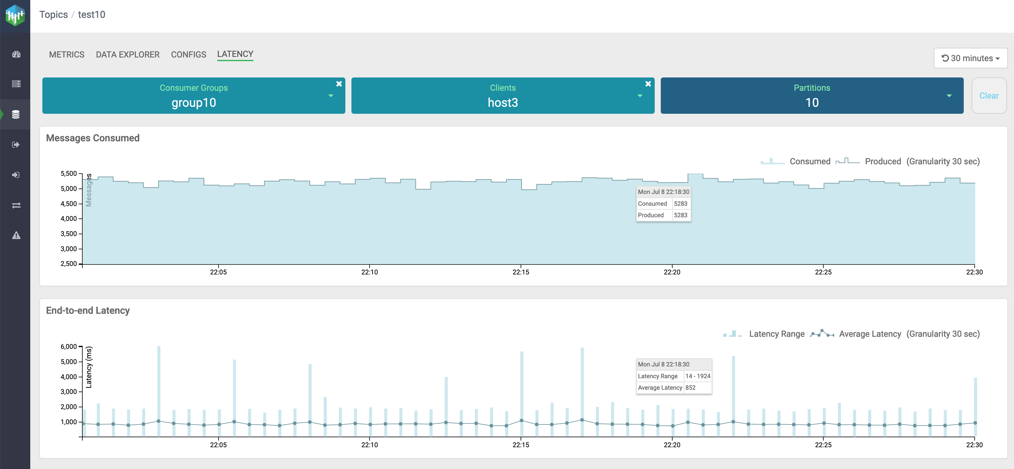 In the above image, you select group10 consumer group to inspect the latency and message counts for each client.