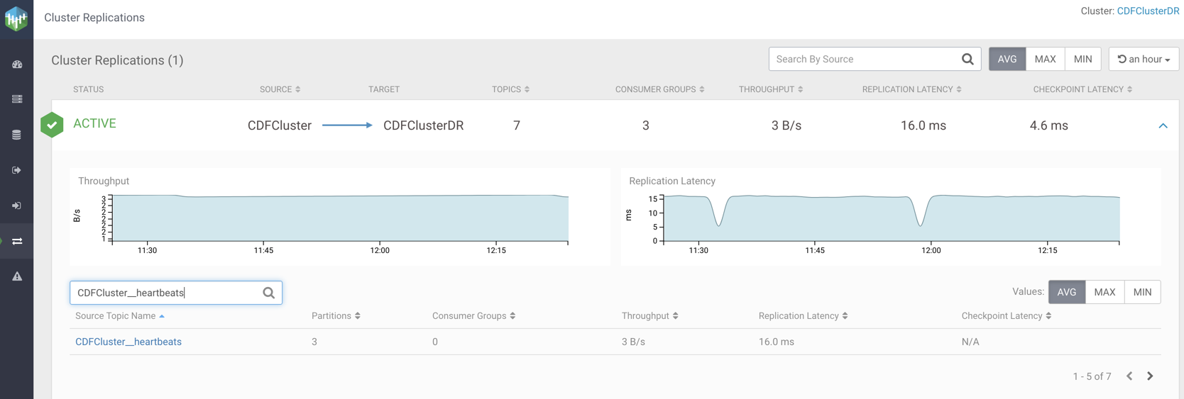 groups, throughput, replication latency, and checkpoint latency for that topic.