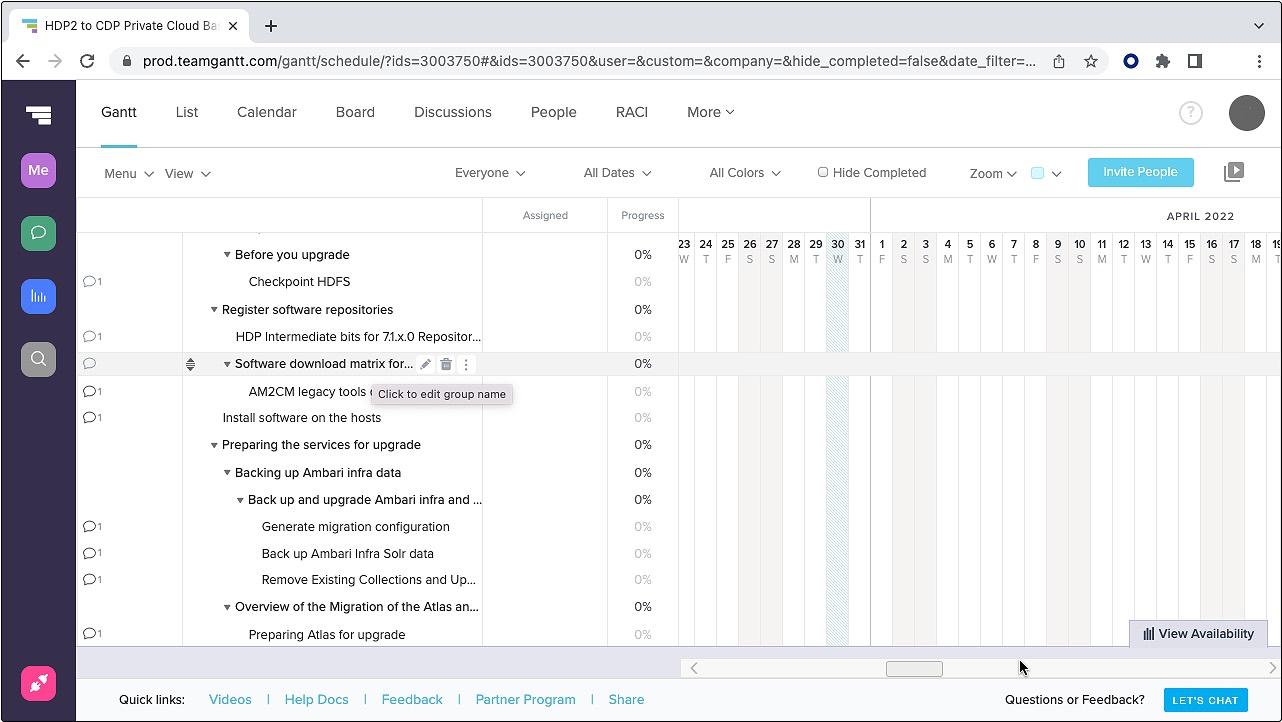 Use the following files to assist your Cloudera upgrade project in any way helpful. The file structure has rows reflecting topics from Cloudera upgrade documentation and columns labeling the topics, the topic hierarchy, and URLs back to this website. The columns particularly target TeamGantt.com. Upload one of the files to that site to see a graphical view of your upgrade project with expandable/collapsable hierarchical tasks, the ability to assign owners, check off completed items, insert dates, click to view Cloudera documentation, etc. Using TeamGantt.com, however, is not required.