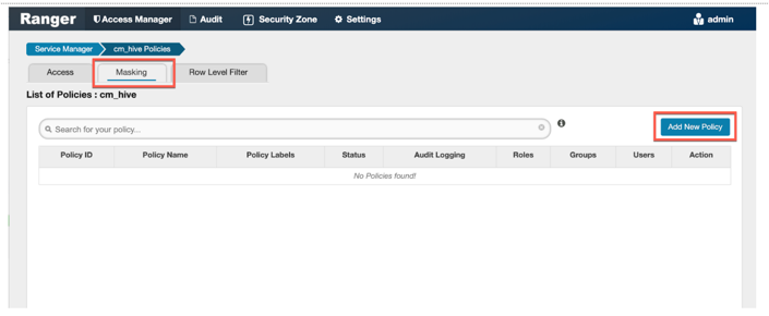 - Navigate to Apache Ranger Access Manager > Service Manager and select Add New Policy as follows: