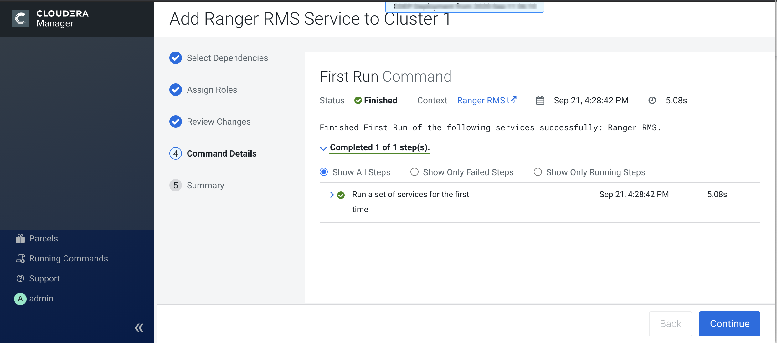 7. On the Command Details page, select run options, then click Continue.