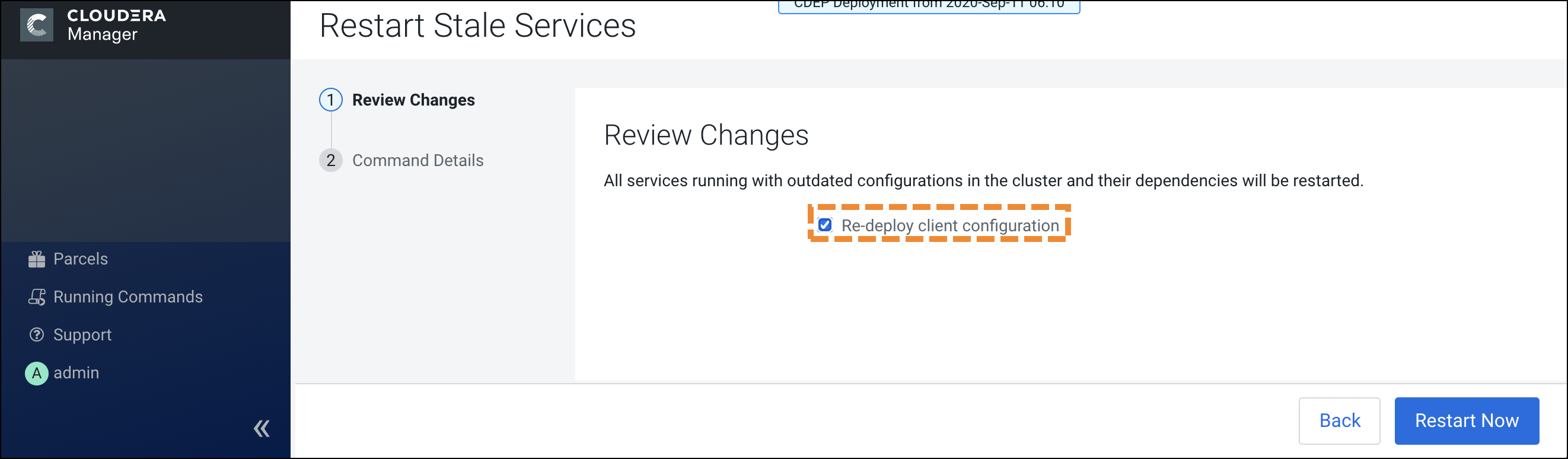 15. On the Restart Stale Services page, select the Re-deploy client configuration option, then click Restart Now.