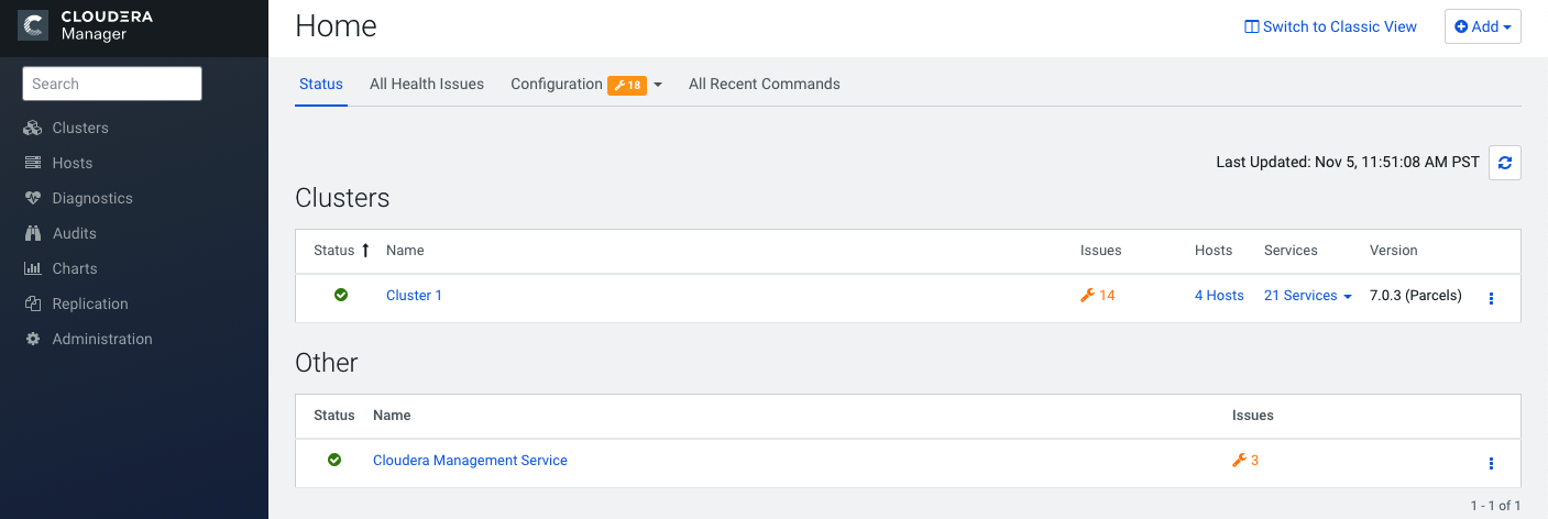 To begin testing, start the Cloudera Manager Admin Console. Once you've logged in, the Home page should look something like this: