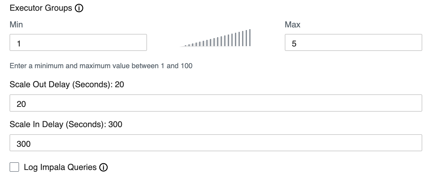 • Scale Out Delay: Sets the length of time in seconds to wait before adding more executors if queries wait in the queue.
